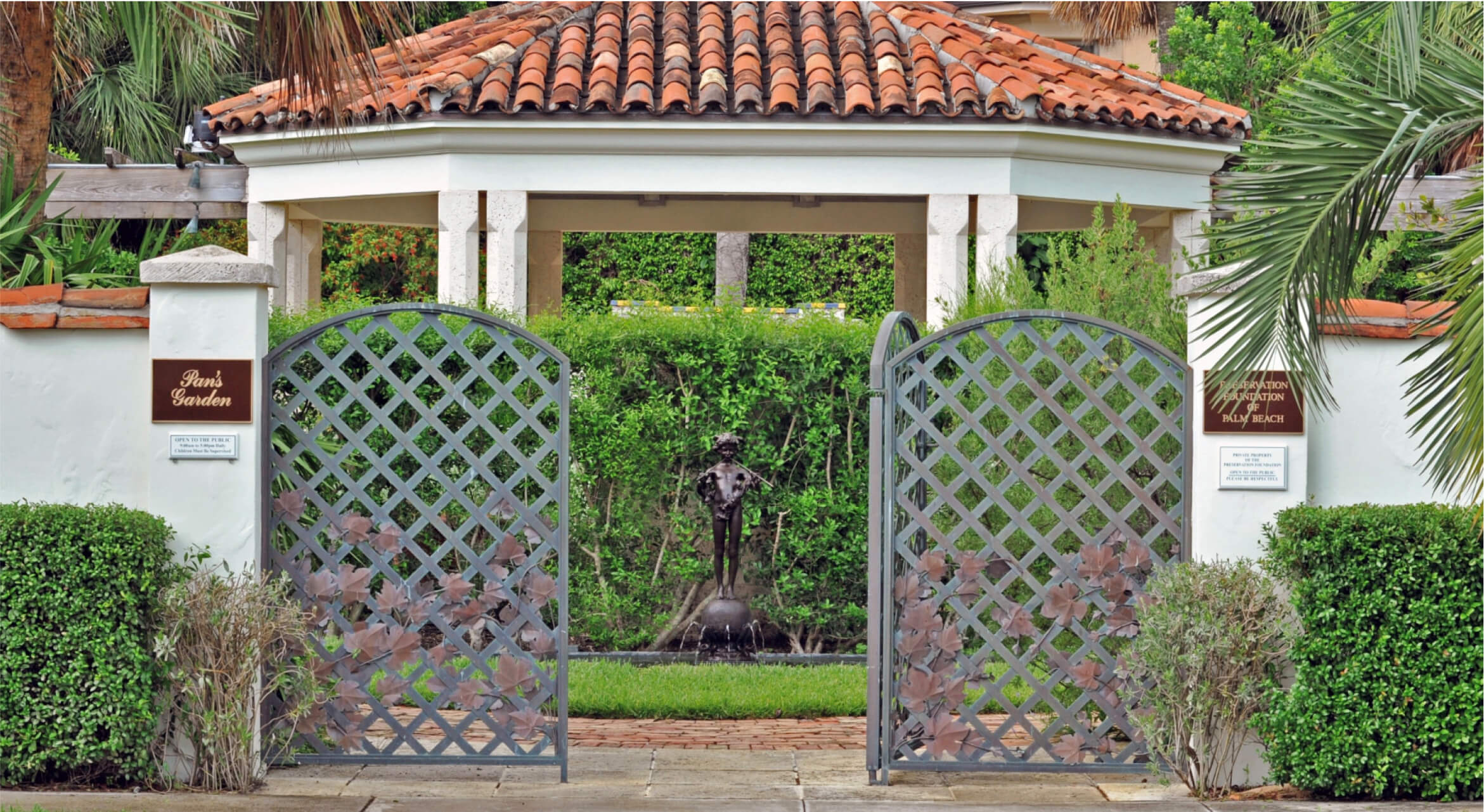 A significant feature of Pan’s Garden is the Casa Apava wall. The historic tile wall, which dates to the 1920s, was saved from the Casa Apava estate on South Ocean Boulevard and forms a dramatic backdrop for the western boundary of the garden.